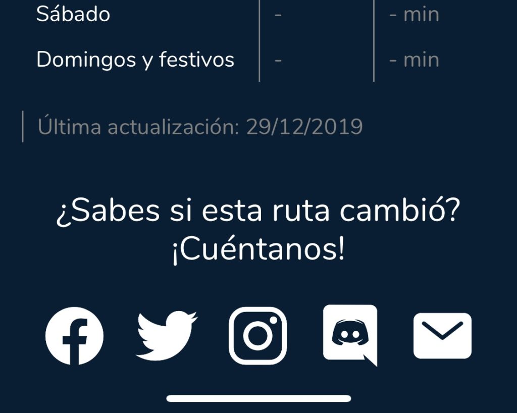 Para la facilidad de los usuarios, agregamos botones de redes sociales en el detalle de rutas. Así, al pulsar en alguno de ellos, se abre una conversación directa con nosotros. En el caso de Facebook y correo electrónico, incluimos un mensaje que contiene los datos de la ruta ya escritos.