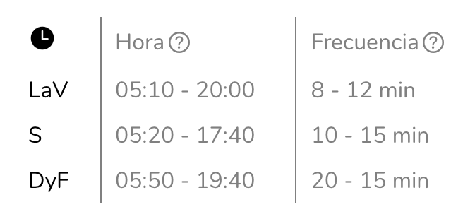 Manejamos los horarios de lunes a viernes, sábados y domingos festivos, la hora en la que sale el primer servicio y la hora en la que sale el último. Por último, la frecuencia en tiempo que sale cada bus detrás de otro tanto en horas pico como en horas valle.
